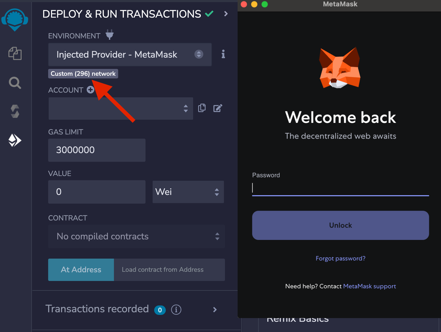 If you’re not signed into your MetaMask account, a window will pop up prompting you to log in. Sign in and make sure you’re connected to the Hedera Testnet and verify that the network is configured correctly to Custom (296) network.