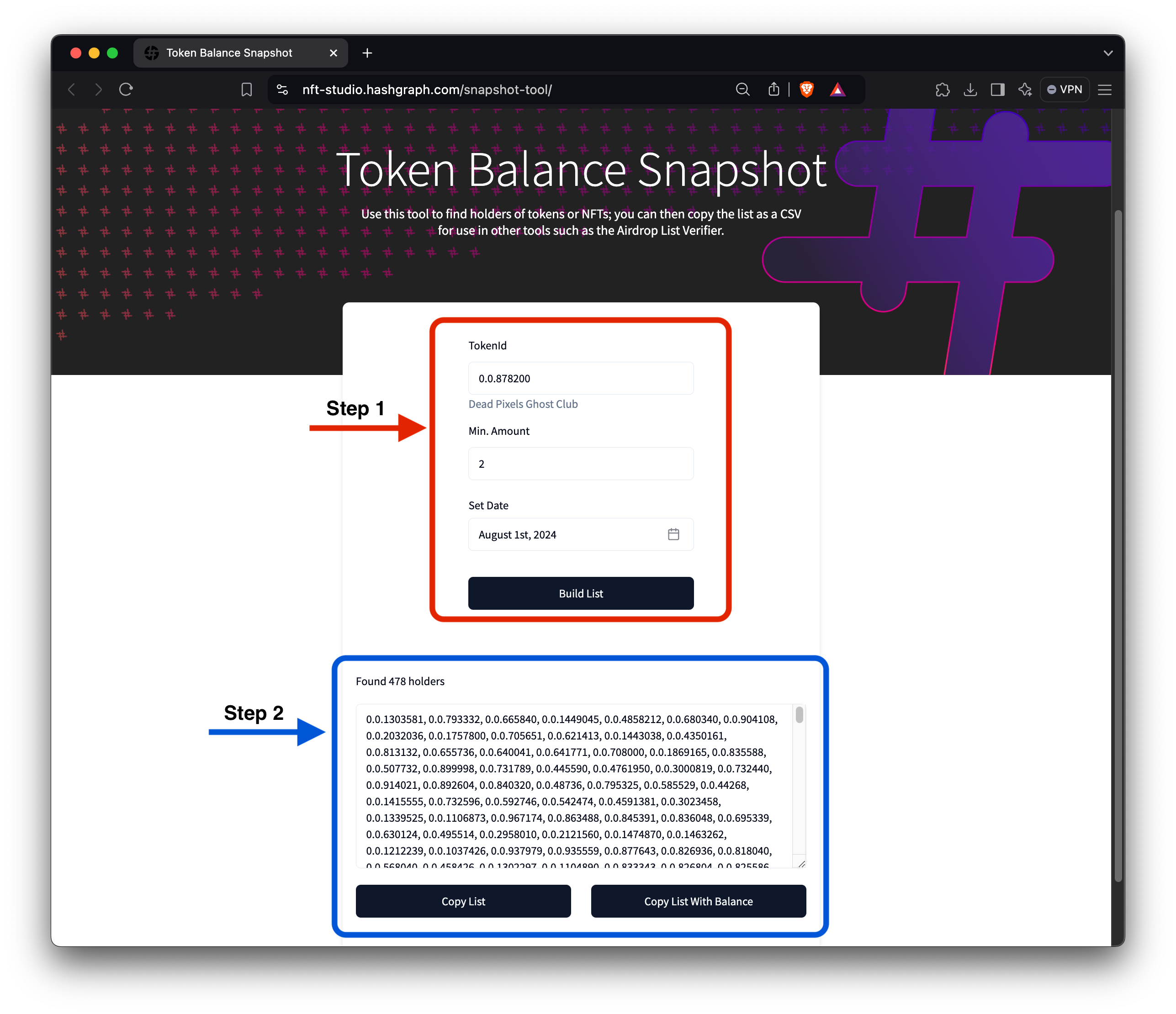 We will use the Dead Pixels Ghost Club (0.0.878200) collection as an example for this short demo. Input the token ID (required) of the NFT collection to generate a snapshot of all token holders.